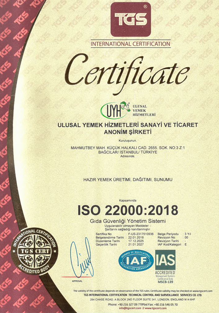 ISO 22000 2018 GIDA GÜVENLİĞİ YÖNETİM SİSTEMİ - GEÇERLİLİK TARİHİ 21.01.2027